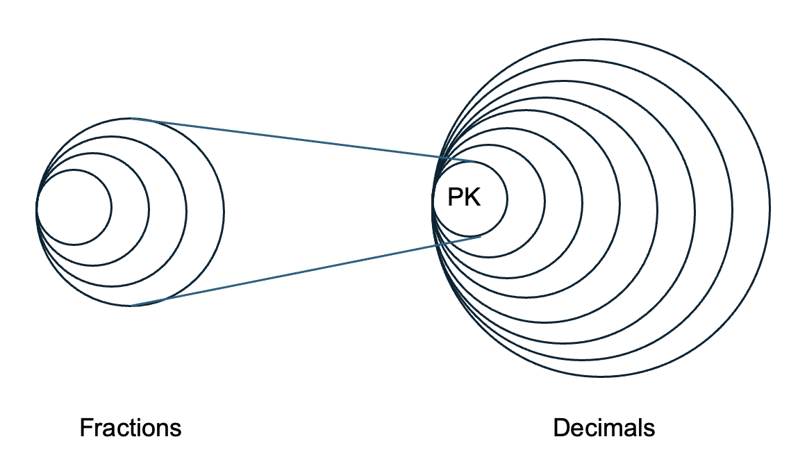 It is also important to state that although this model does have an underlying hierarchy to its levels or layers, there is no intentional judgment of the outer layers being better or more advanced mathematically. In fact, as new mathematics is developed we often see experienced mathematicians moving through various levels of this model. The innermost layer called, Primitive Knowing, does not imply a low-level understanding of concepts, but rather a basic series of knowledge and skills needed to pursue a new concept that is under development. For example, the Primitive Knowing layer for a new concept being developed by the learner may actually represent an outermost layer of understanding for a previously developed concept that is utilized in the development of the new concept. Pirie and Kieren use the example of fractions and decimals where a fairly sophisticated understanding of fractions is used as a starting point for the development of decimal concepts. In a sense, this could be thought of as an onion within an onion (see Figure 1.1.2) to use our “garden” variety analogy.