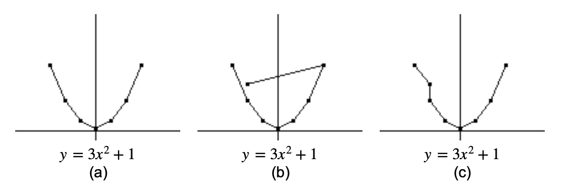 If we examine the first function, we can see how the students’ responses are related to their location within the model. After the students had been given the opportunity to sketch several of the graphs, the teacher then gave a new point, \((-2,20)\) to include in the graph of the first function, \(y=3x^2+1\text{.}\) The students’ responses help illustrate the components of the various levels. For example, if a student simply connects the new point to the end of the existing graph as in graph (b) in Figure 1.1.4, this student is still image doing. Here the student is still simply following directions and not reflecting on the different graphs. Now suppose the student eliminates the segment between \((-3,28)\) and \((-2,13)\) and then proceeds to connect the new point into the graph as shown in (c). This student is image reviewing since they have reviewed their previous graphs and inserted the new point into a pattern that they think the graph should follow. These two examples describe students who are in the Image Making level of the Pirie and Kieren model.