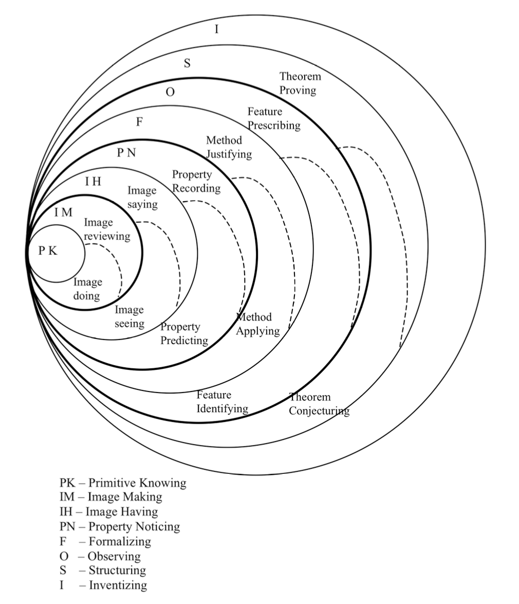 - Structuring : The learner begins to think about formal observations as an interconnected and interrelated set of theorems coming together to form a theory. The learner also now sees the need for verification and justification of mathematical propositions through proof or arguments.