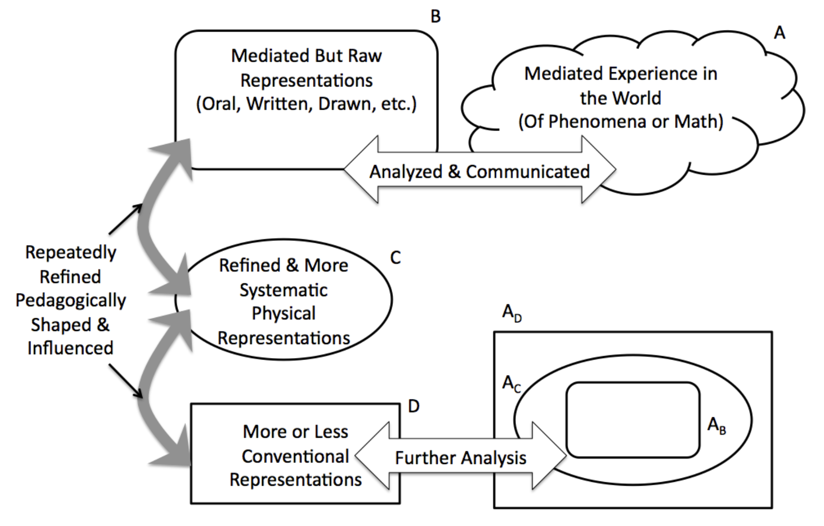 So how does the use of symbol systems influence our learning, and even more, our development of new ideas? Kaput, Blanton, and Moreno (2008) propose a model that describes how we develop both our understanding of existing ideas as well as the creation new concepts. The key to this model is the communication and analysis between two worlds. One is the "real world" (i.e. the world of either broader mathematical or physical experiences) and the other is the world of the symbols that we use to represent these "real world" experiences. In this model, the learner creates raw representations of ideas and in turn these representations provide the learner with a tool to reason about these ideas. As the learner uses these raw representations for reasoning, they begin to view the "real world" experiences differently as the representations serve as a lens through which reality is filtered. As this process progresses, new, more refined representations and symbols are created influencing both the tools used for reasoning as well as the learner’s view of the real world itself (Figure 1.1.5). You will note that the diagram contains various incarnations of reality as influenced by different symbol systems. Reality is a social construct (although there are certain facts about the world around us) in that we interpret information collected by our senses through the lenses of our experience. Here \(A_B\) represents reality (\(A\)) as viewed through the representation system, \(B\text{.}\) Similarly, \(A_C\) represents reality (\(A\)) as viewed through the representation system, \(C\text{,}\) and so on. Our view of reality is constantly evolving, influenced by our experiences.