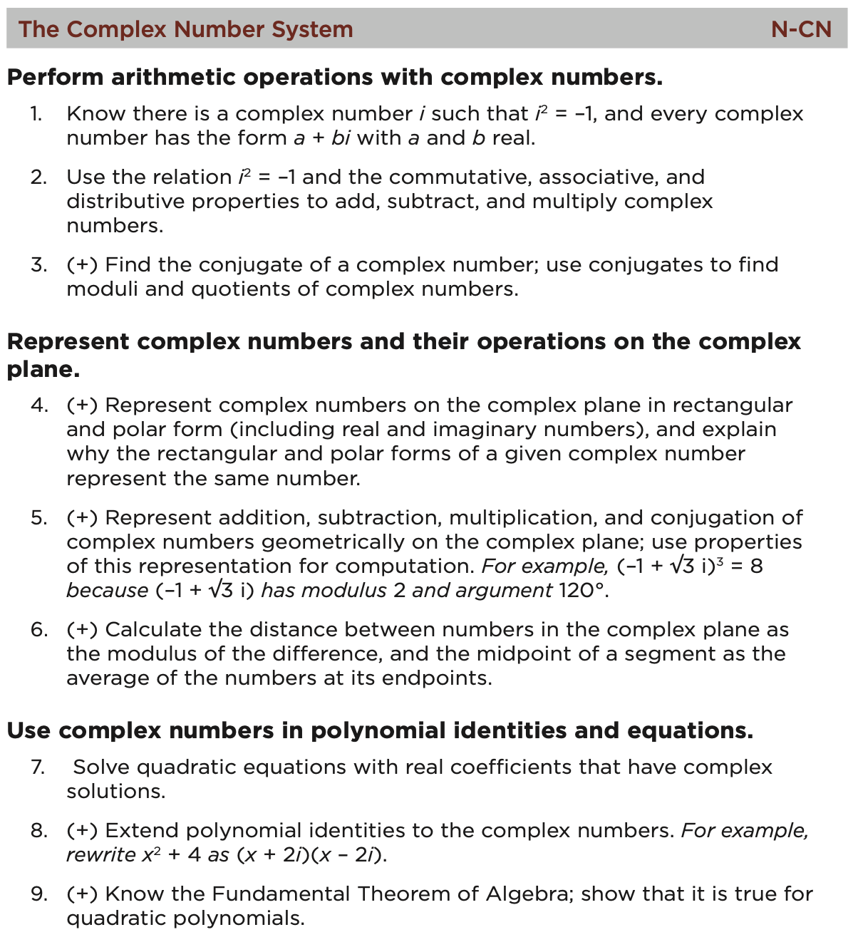 The secondary school curriculum includes the teaching of complex numbers even though some aspects of this are not required for all students graduating from high school. Note that the Common Core State Standards denote this with a (+) symbol next to those topics not expected for all students. However, all secondary teachers must be expected to teach these concepts and certainly any student planning to enter scientific fields should be expected to leave high school having exerpience with complex numbers. Below in Figure 2.2.1 are the standards from the CCSS with regard to complex numbers.