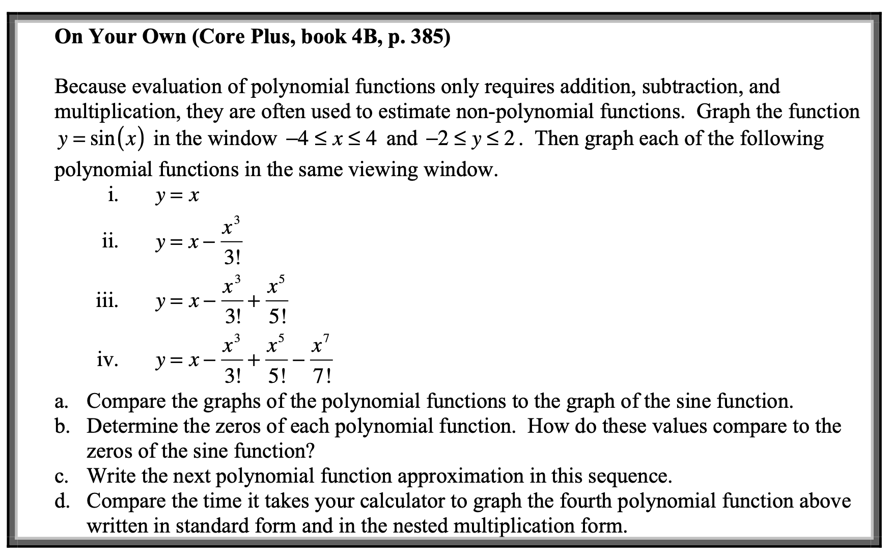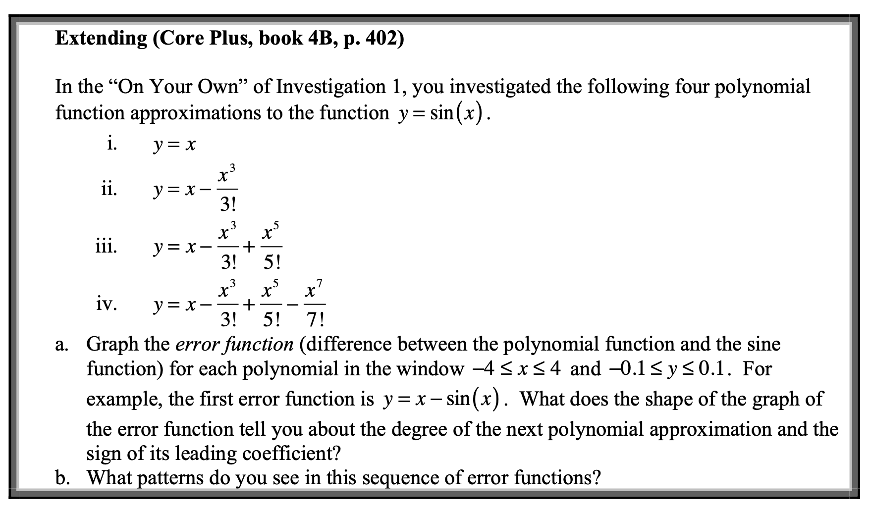 Jan has been teaching polynomials and factoring out of Lesson 2 of the Contemporary Mathematics in Context: A Unified Approach (Core-Plus) curriculum. She assigned students to work on the “On Your Own” question found on page 385 of book 4B as well as the “Extending” questions found on pages 402-403 (see Figure 2.2.2 and Figure 2.2.3). During the next class period, she facilitated a discussion of the homework assignment. Within the discussion, Jeff asked, “I was able to do the error function graphs and I understand that the longer the polynomial, the closer we get to matching the sine function, but how did they come up with those polynomial functions? They all have weird coefficients and stuff.”