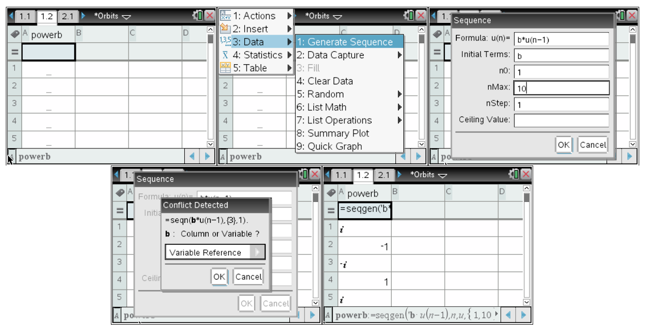 For each element in the set \(Q\text{,}\) find the first power you must use to give a result of 1. Here you may want to use the algebraic capabilities of the spreadsheet to quickly check. For example, below we see the use of the Lists and Spreadsheet page to quickly produce the powers of the element, \(b\text{.}\) Here the first time \(b\) to a power gives the result of 1 is for the exponent 4.