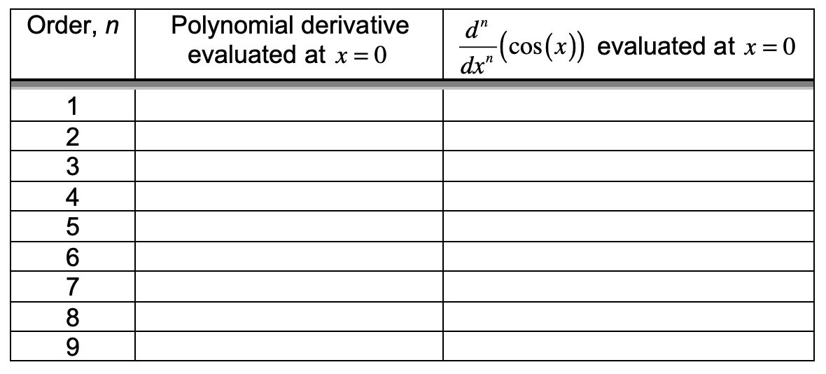 Now find the 8th degree Taylor polynomial for \(f\left(x\right)=\cos\left(x\right)\) using your CAS’s Taylor command. Repeat what you did in part (f). Record your results in a table like the one in Figure 2.2.6 and state your observations related to your results.