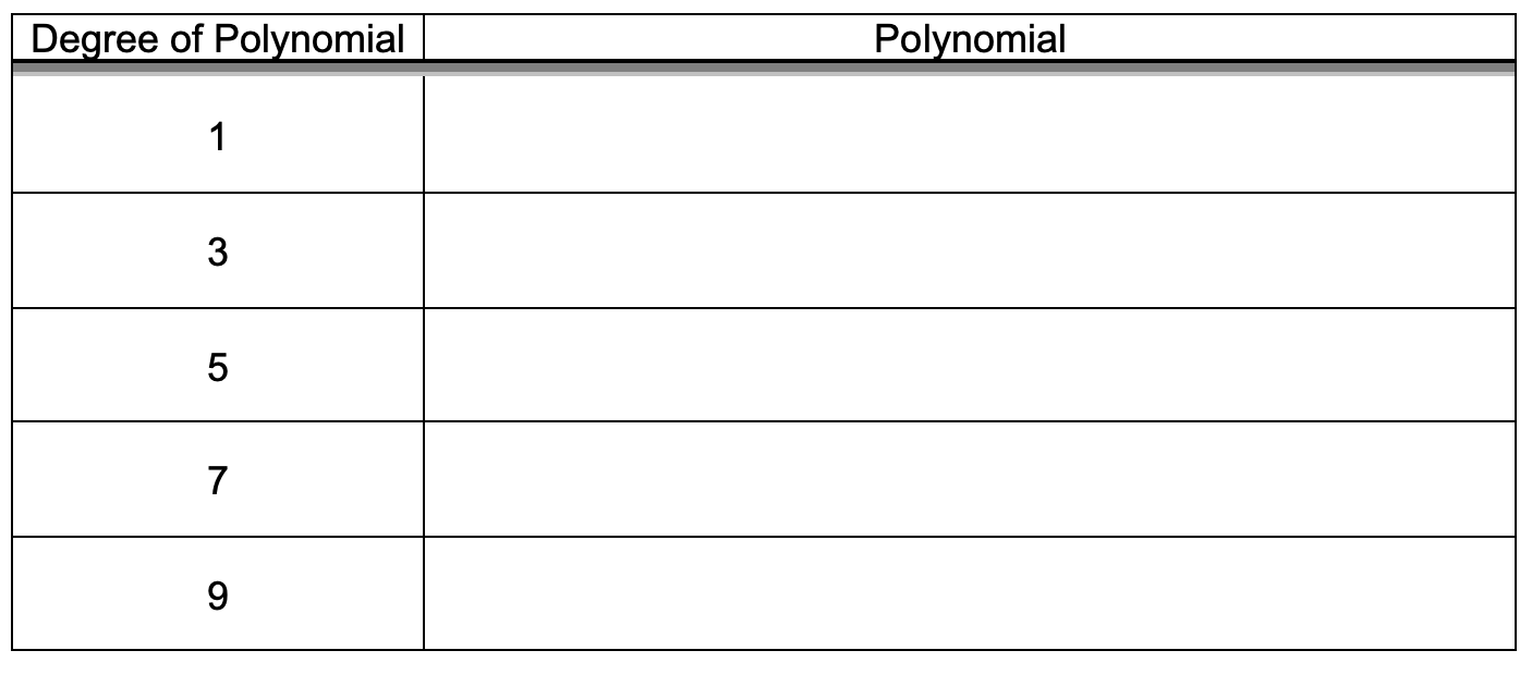 Describe what type of investigation you might give your students to help them discover the strategy for constructing appropriate polynomials that imitate the sine function. Be very specific and include actual questions you would give the students for investigation.