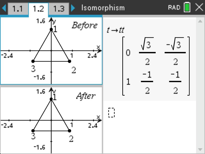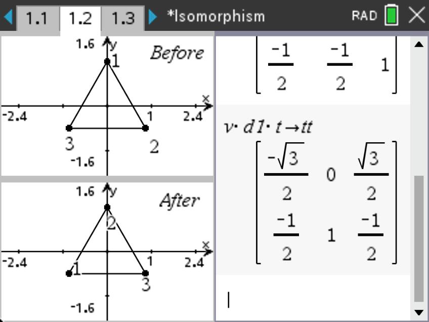 While we can use physical triangles to do these manipulations, we can also do it virtually by using matrix transformations. To help with performing the moves, we will use a set of matrices on the TI-Nspire CX CAS. These six matrices will take the original vertices and map them to their new locations. For your convenience, the matrices have been given names corresponding to our original names for the triangle moves as follows (see TI-Nspire document page 1.2).